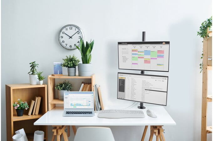 - Mocowanie 2 monitorów do jednego uchwytu pozwala zmaksymalizować wykorzystanie miejsca na biurku.