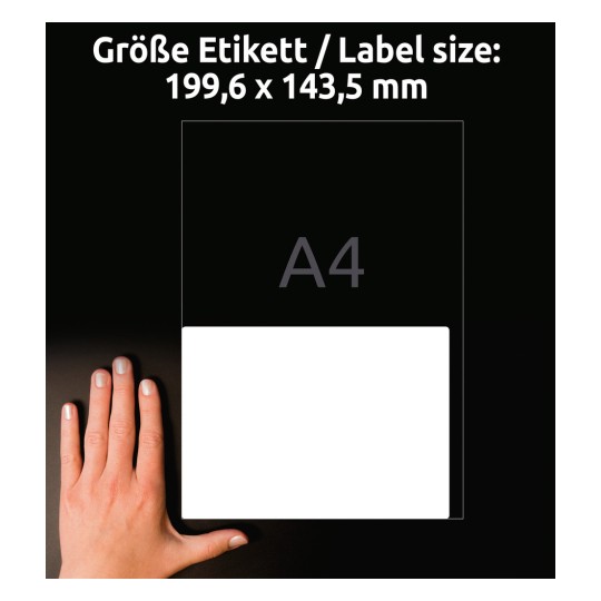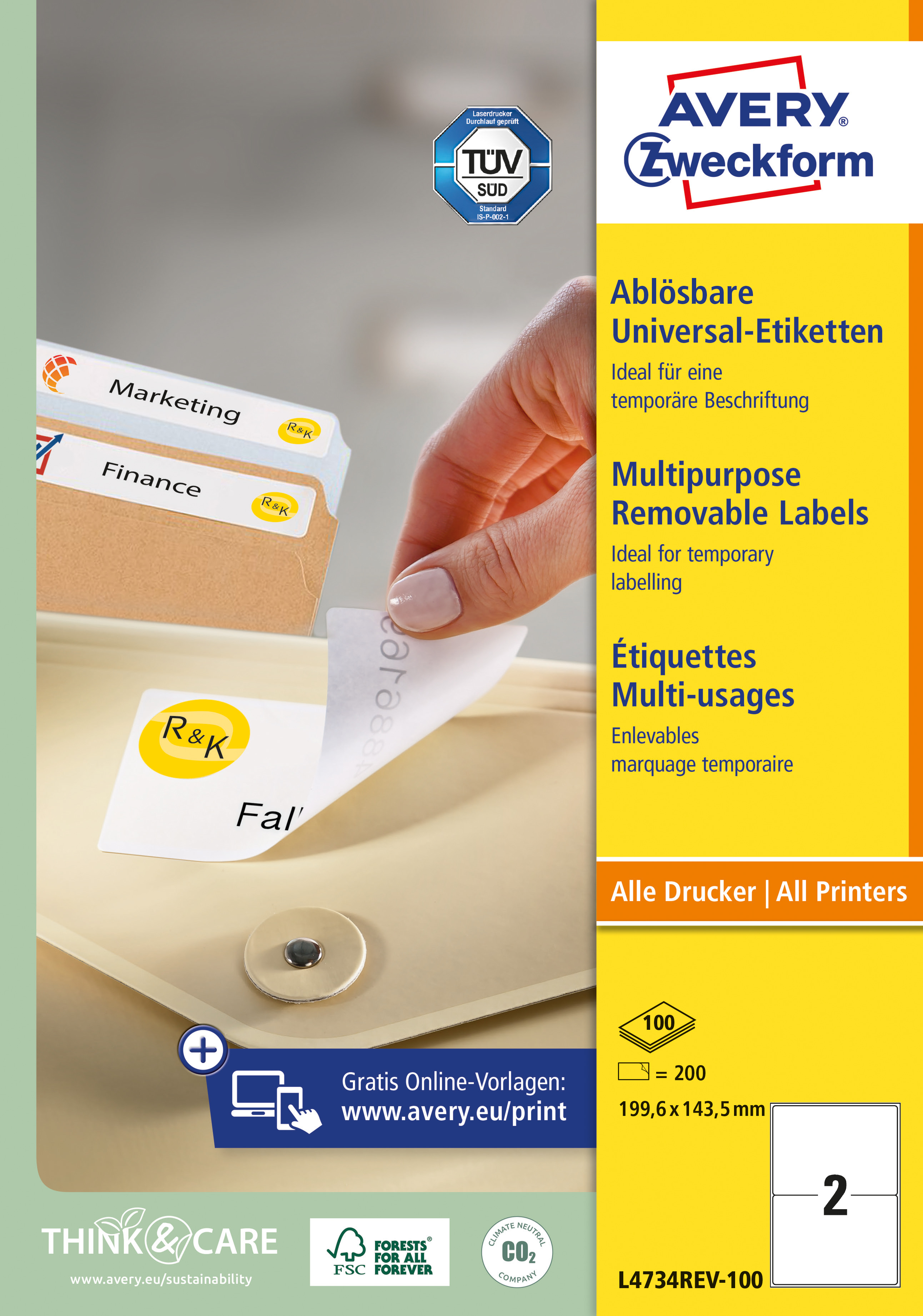 Usuwalne etykiety papierowe 199,6 x 143,5 mm, białe etykiety samoprzylepne, etykiety do druku 100 ark. / op., Avery L4734REV-100