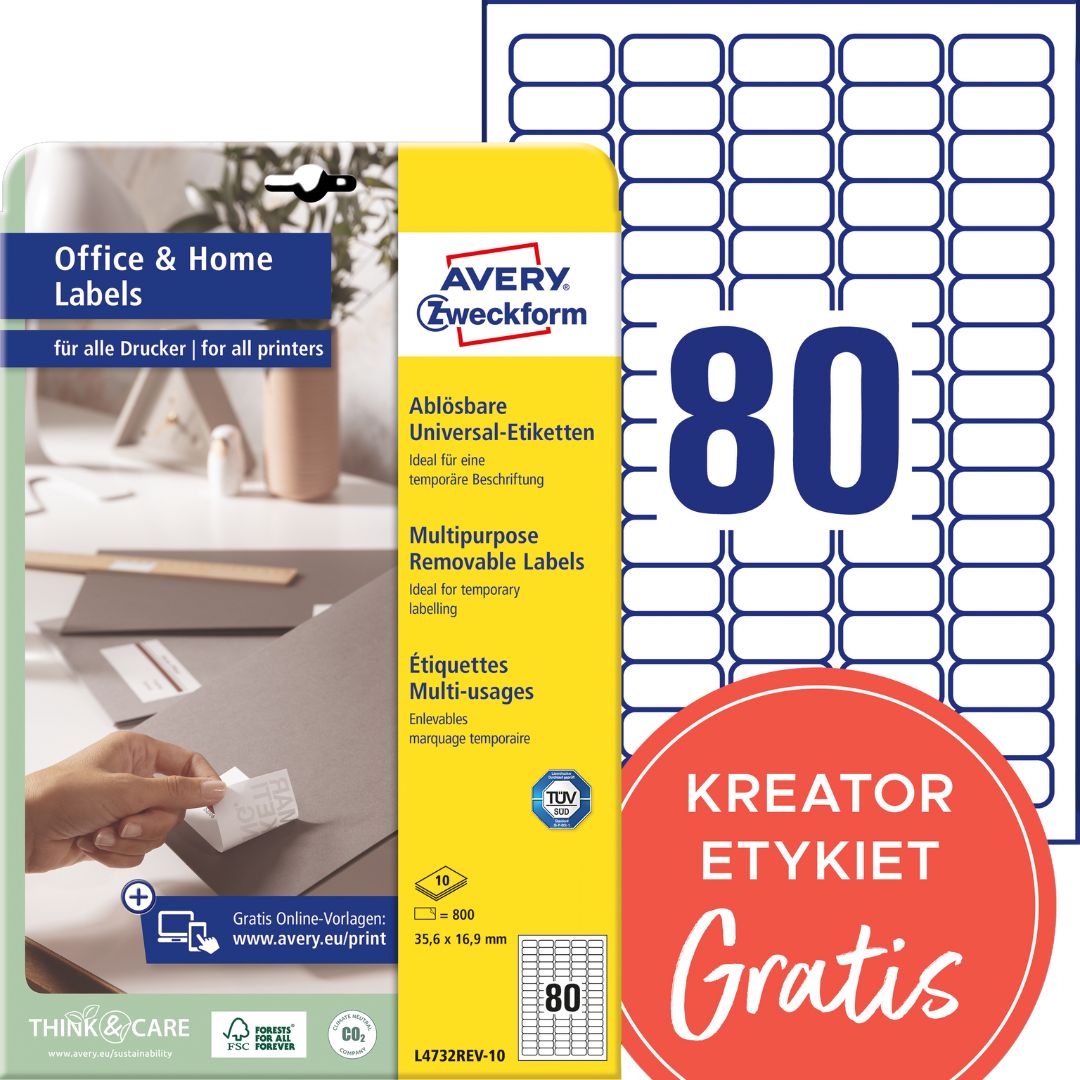 Usuwalne etykiety papierowe 35,6 x 16,9 mm, białe etykiety samoprzylepne, etykiety do druku 10 ark. / op., Avery L4732REV-10