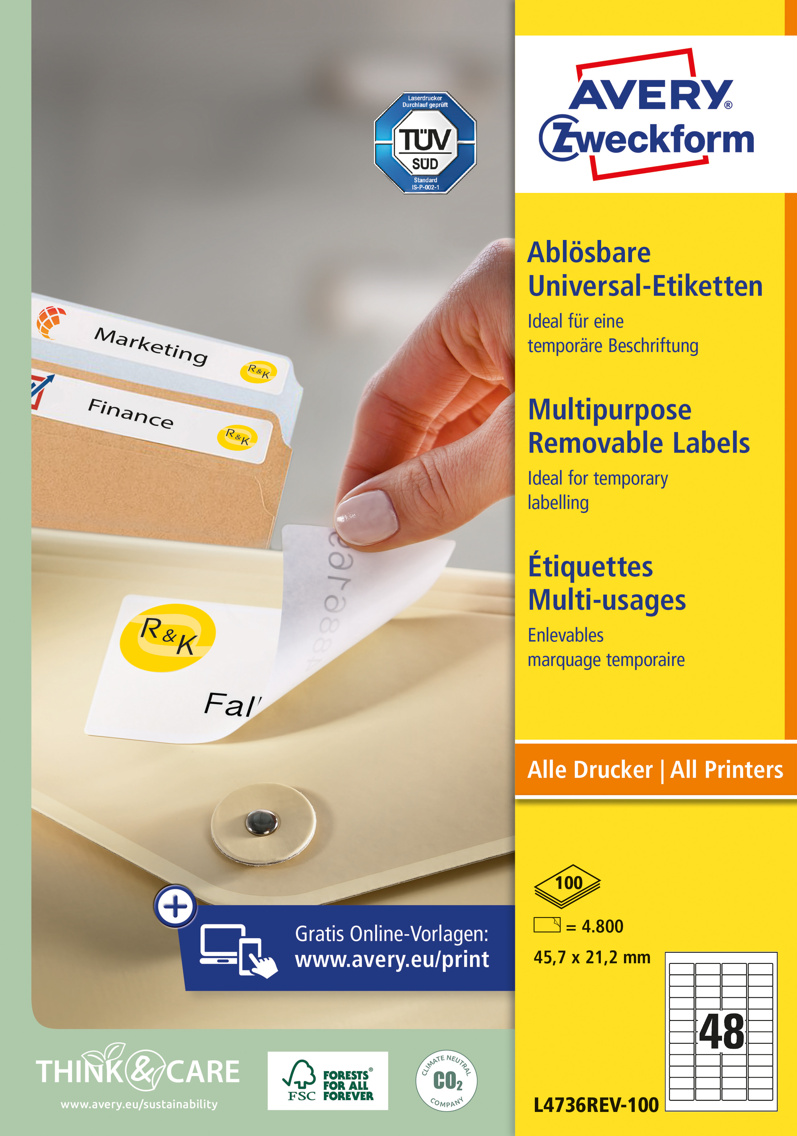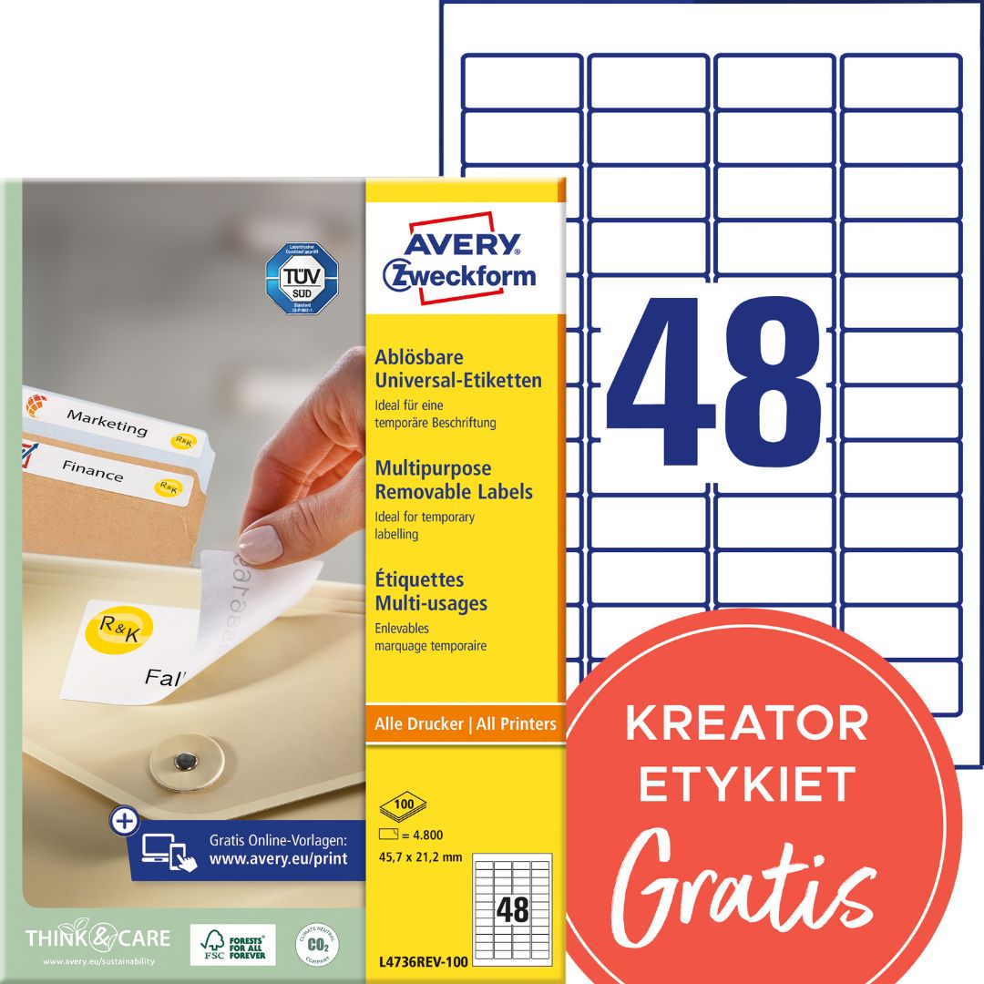Usuwalne etykiety papierowe 45,7 x 21,2 mm, białe etykiety samoprzylepne, etykiety do druku 100 ark. / op., Avery L4736REV-100