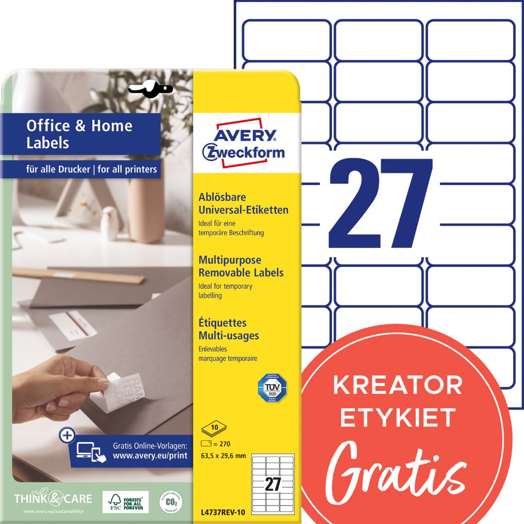 Usuwalne etykiety papierowe 63,5 x 29,6 mm, białe etykiety samoprzylepne, etykiety do druku 10 ark. / op., Avery L4737REV-10