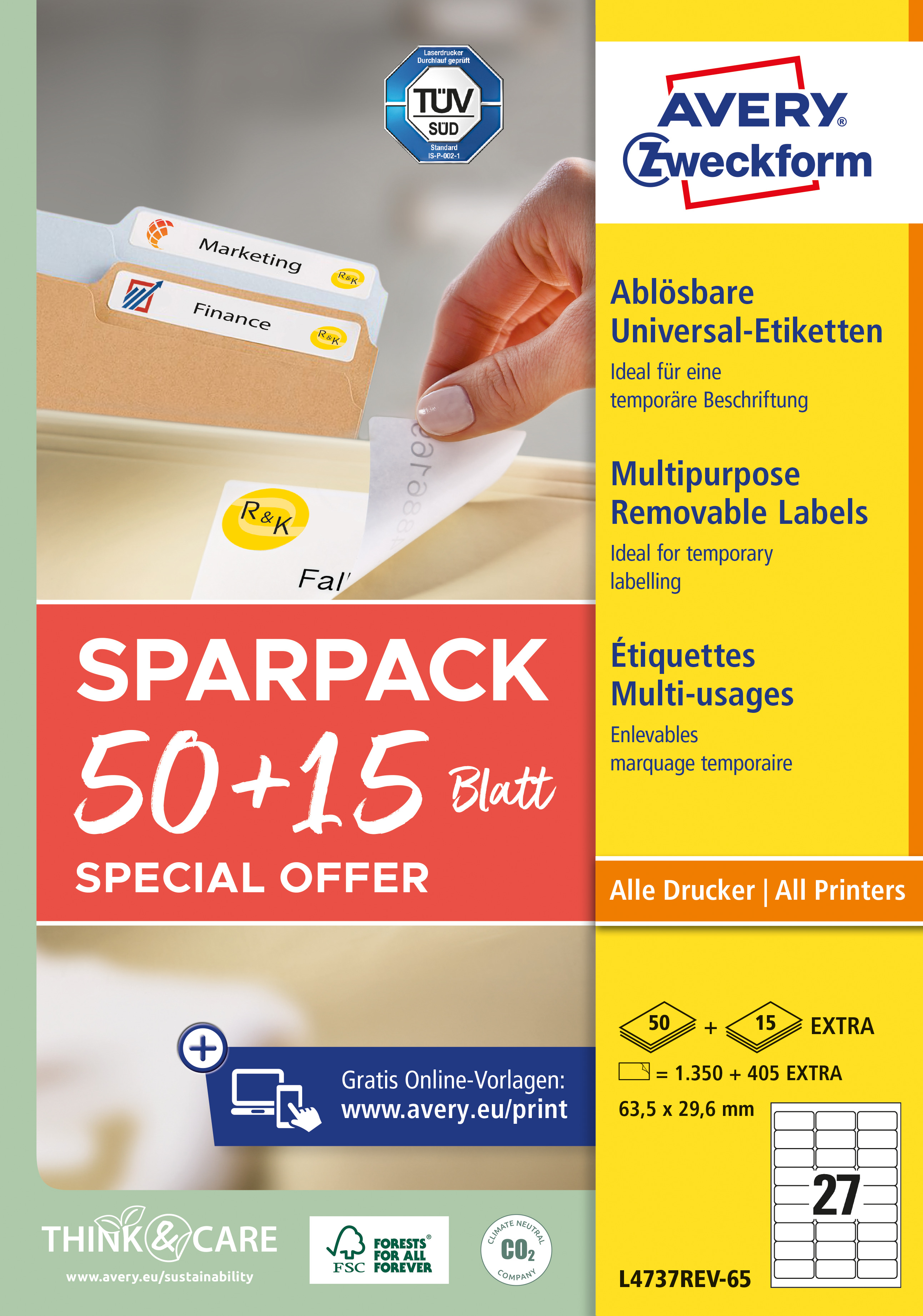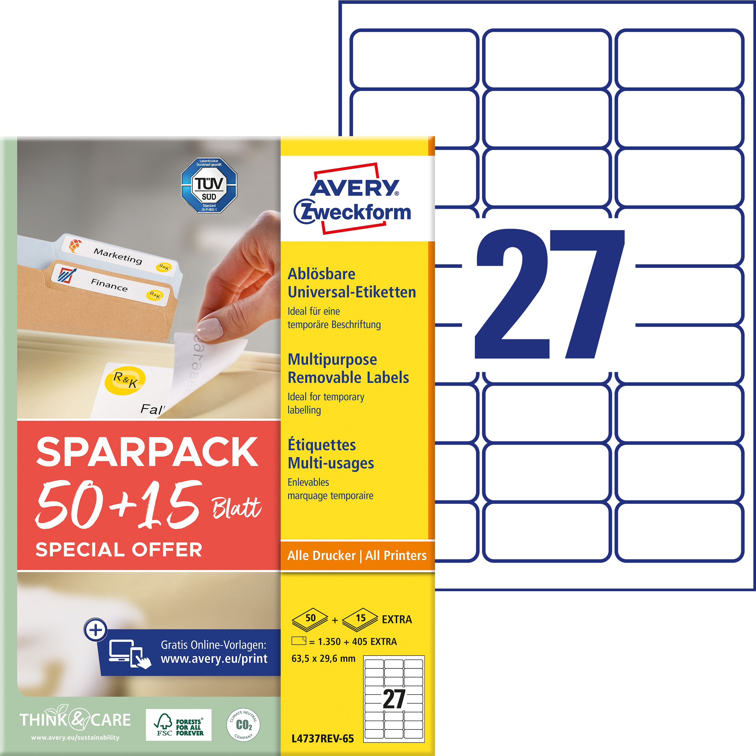 Usuwalne etykiety papierowe 63,5 x 29,6 mm, białe etykiety samoprzylepne, etykiety do druku 65 ark. / op., Avery L4737REV-65