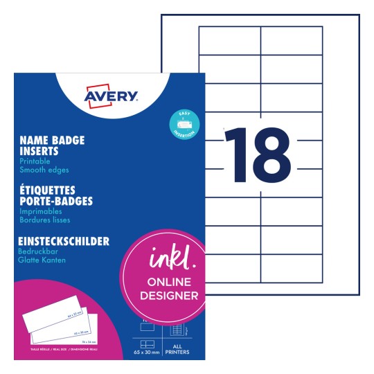 Wkłady do identyfikatorów Avery DPC6530A-10 / 65 x 30 mm, 10 arkuszy, 180 wkładów - biały