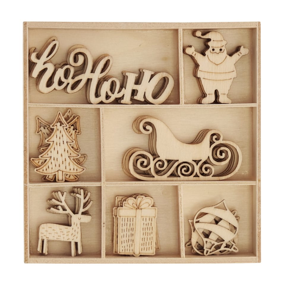 Zestaw drewnianych ozdób/zawieszek świątecznych Pudełko MIKOŁAJ I SANIE - 35 szt/opk